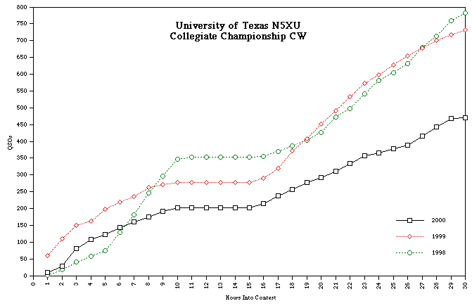 N5XU participated in the Collegiate Championship conducted during the weekend of 4-5 November 2000. We operated in the Multioperator Single Transmitter (M) class, with KB5LBN, W5JLP, N3TNN, KT5I, and WM5R operating.
