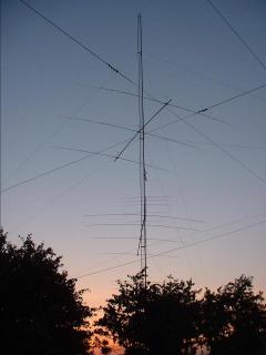 Mark's station is on a ridge line in the grassland hills southwest of Bartlesville, about 35 kilometers south of the border with Kansas. It seems to have a really excellent horizon, with good clearance over the nearby terrain. Mark has four towers, although most of the antennas are on just two of the towers. Each of the two 140' towers had a 40 meter monobander, a 20 meter monobander, a 15 meter monobander, and two (phased) 10 meter monobanders. The antennas on one tower all face northeast, the antennas on the other tower all face northwest. The week before the contest, Mark put up a tribander (10-15-20) pointed south, and there was a single wire antenna each for 80 meters and 160 meters. All of the antennas were in fixed position - there were no rotors involved.