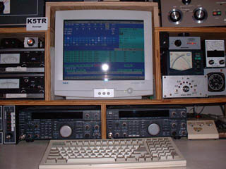 George hooked up the station so that almost all of the antennas were available on the left radio. The switching arrangement allowed me the flexibility of combining almost any combination of the antennas I could need, although some of the combinations including the fixed west antenna had moderately high SWR. The right radio was connected to a half-wave vertical, mounted about 20' up in the air, that George was borrowing from KI5DR. It was very useful for finding new stations to work while I was calling CQ on the other radio. About half of the time, I was able to get through on the vertical, but the other half of the time I'd have to quickly QSY the run rig and use the yagis. I did occasionally make an S&P pass with the yagis because not every station I heard on the yagis was also audible on the vertical and vice versa.
