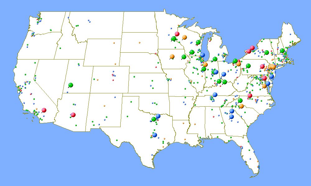 Locations of USA stations that entered the 2001 ARRL 160 Meter Contest, color-coded by entry class, with "Top Ten" stations represented by large pushpins. Red is single-op QRP, green is single-op low power, blue is single-op high power, and orange is multi-op. Again, higher-scoring dots are drawn on top of lower-scoring dots.