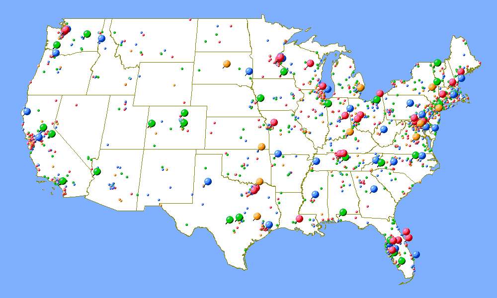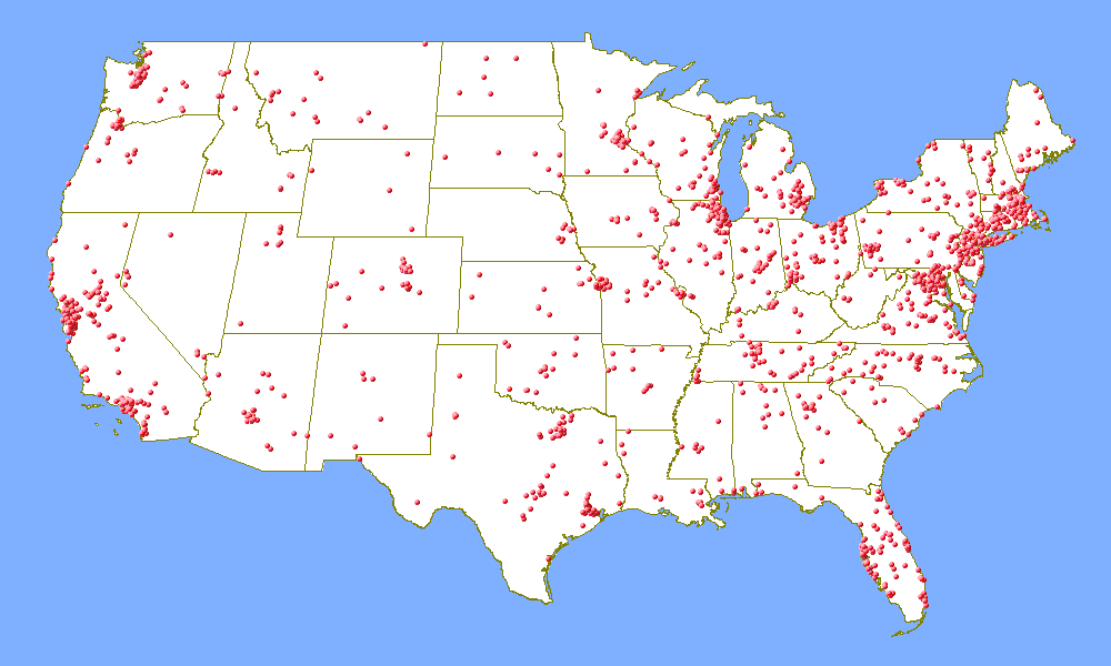 The following maps were generated from the ARRL's online contest database of results for the 2002 ARRL Ten Meter Contest. Callsigns are matched up to ZIP codes using the FCC database, which are then matched up to latitude and longitude (which means that two stations in the same ZIP code will be given the exact same latitude and longitude values.) The mapping software I used only does maps the United States of America, so these maps are limited to only U.S. contestants. Furthermore, these maps only represent U.S. contestants that submitted a log to the ARRL after the contest. There are certainly many more stations across the country who operate the contest, but do not send in their logs.