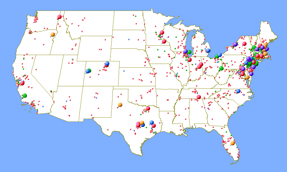 Locations of USA stations that entered the 2002 ARRL International DX Contest, Phone, color-coded by entry class. Red is single-op, green is single-op-assisted, blue is multi-single, orange is multi-two, and purple is multi-multi. Again, higher-scoring dots are drawn on top of lower-scoring dots.