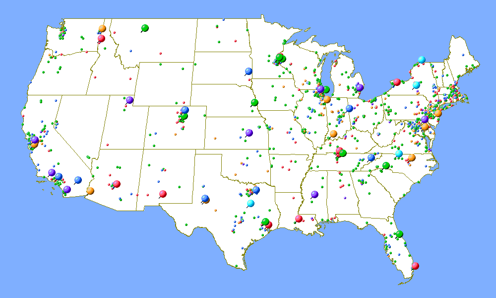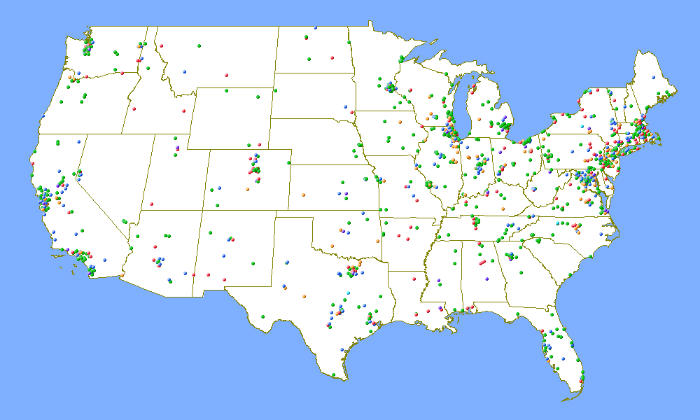 The following maps were generated from the ARRL's online contest database of results for the 2002 ARRL November Sweepstakes, CW. Callsigns are matched up to ZIP codes using the FCC database, which are then matched up to latitude and longitude (which means that two stations in the same ZIP code will be given the exact same latitude and longitude values.) The mapping software I used only does maps the United States of America, so these maps are limited to only U.S. contestants. Furthermore, these maps only represent U.S. contestants that submitted a log to the ARRL after the contest. There are certainly many more stations across the country who operate the contest, but do not send in their logs.