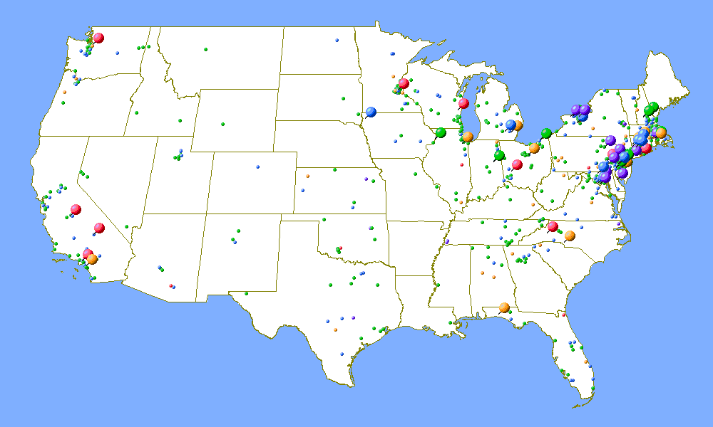 The following maps were generated from the ARRL's online contest database of results for the 2002 ARRL January VHF Sweepstakes. Callsigns are matched up to ZIP codes using the FCC database, which are then matched up to latitude and longitude (which means that two stations in the same ZIP code will be given the exact same latitude and longitude values.) The mapping software I used only does maps the United States of America, so these maps are limited to only U.S. contestants. Furthermore, these maps only represent U.S. contestants that submitted a log to the ARRL after the contest and who were not operating in the Rover category. (Entrants in the single operator, portable categry are mapped using their callbook ZIP codes, even though they might have operated from another location.) There are certainly many more stations across the country who operate the contest, but do not send in their logs.
