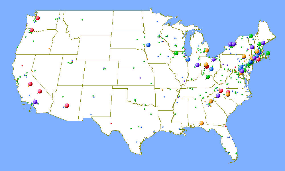 Locations of USA stations that entered the 2002 ARRL September VHF QSO Party, color-coded by entry class, with "Top Ten" stations represented by large pushpins. Red is single-op portable, green is single-op low power, blue is single-op high power, orange is multi-limited, and purple is multi-unlimited. Again, higher-scoring dots are drawn on top of lower-scoring dots. Rover stations are not included in this map.
