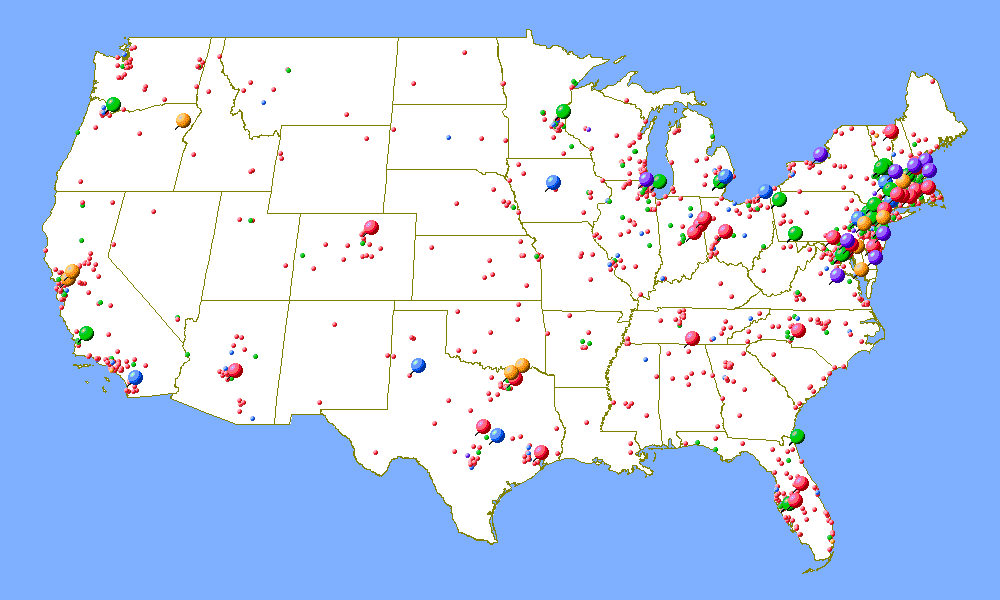Locations of USA stations that entered the 2003 ARRL International DX Contest, Phone, color-coded by entry class. Red is single-op, green is single-op-assisted, blue is multi-single, orange is multi-two, and purple is multi-multi. Again, higher-scoring dots are drawn on top of lower-scoring dots.