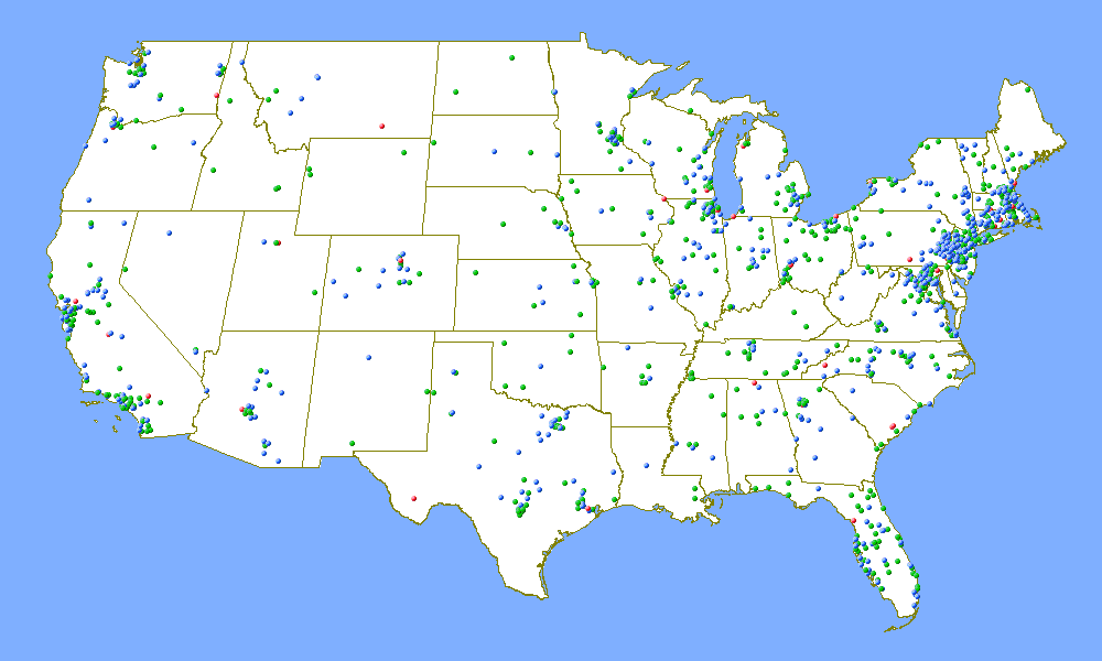 Locations of USA stations that entered the 2003 ARRL International DX Contest, Phone, color-coded by power. Red is QRP, green is Low Power, and blue is High Power. Higher-scoring competitors have their dots drawn on the map after lower-scoring competitors. (This means that if two competitors are very close to one another, and one operates high power and scores more than the other, who operates low power, you might not see the low power dot, as it will be covered up by the high power dot.)