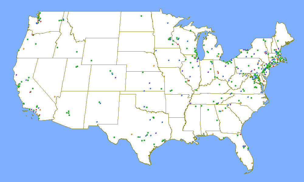 Locations of USA stations that entered the 2003 ARRL September VHF QSO Party, color-coded by entry class. Red is single-op portable, green is single-op low power, blue is single-op high power, orange is multi-limited, and purple is multi-unlimited. Again, higher-scoring dots are drawn on top of lower-scoring dots. Rover stations are not included in this map.
