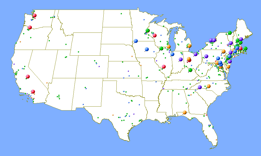 Locations of USA stations that entered the 2003 ARRL September VHF QSO Party, color-coded by entry class, with "Top Ten" stations represented by large pushpins. Red is single-op portable, green is single-op low power, blue is single-op high power, orange is multi-limited, and purple is multi-unlimited. Again, higher-scoring dots are drawn on top of lower-scoring dots. Rover stations are not included in this map.