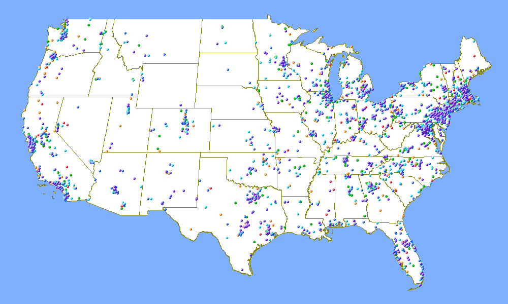 The following maps were generated from the ARRL's online contest database of results for the 2004 ARRL International DX Contest, CW. Callsigns are matched up to ZIP codes using the FCC database, which are then matched up to latitude and longitude (which means that two stations in the same ZIP code will be given the exact same latitude and longitude values.) The mapping software I used only does maps the United States of America, so these maps are limited to only U.S. contestants. Furthermore, these maps only represent U.S. contestants that submitted a log to the ARRL after the contest. There are certainly many more stations across the country who operate the contest, but do not send in their logs.
