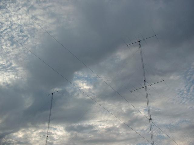 The tower on the left is the 40 meter tower, with a stack of Cushcraft XM240 two-element monobanders, and the tower on the right is the 20 meter tower, with a stack of Cushcraft XM520 five-element monobanders. |