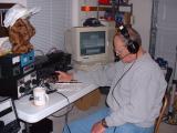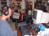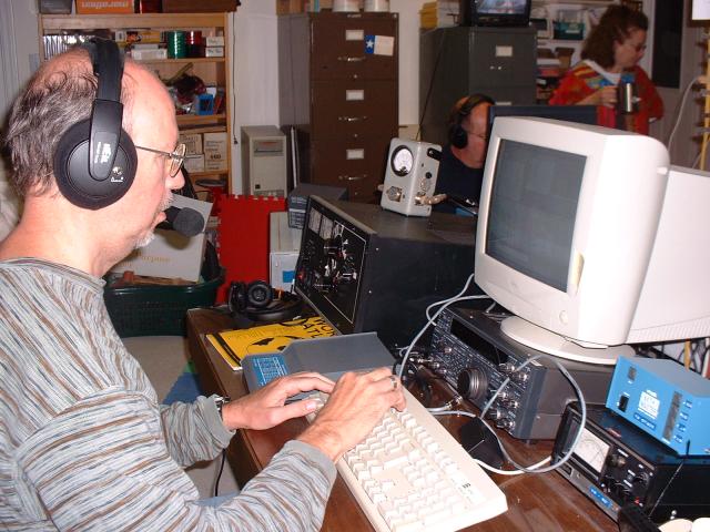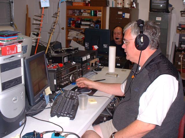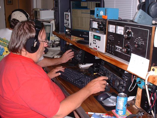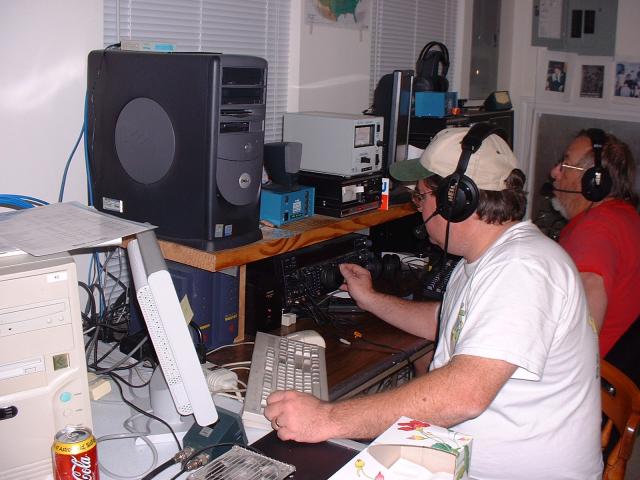 Scott Pederson KI5DR on 10 meters around 2000 UTC Sunday. The head poking above the monitor is Robert Brandon K5PI on 20 meters. |