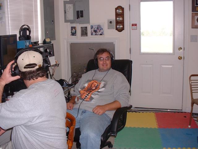 Saturday morning, with Reid Hill KC5YKX on 15 meters and Scott Pederson KI5DR on 40 meters. The colorful interlocking children's foam play mats on the floor covered coaxial and other cables, so that we could walk around and not worry about tripping on or damaging the cables. |