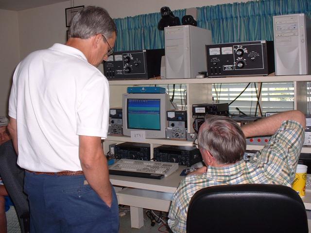 Bryan Edwards W5KFT, explaining some aspect of the station to Bob Yeargain W5EK.
