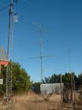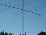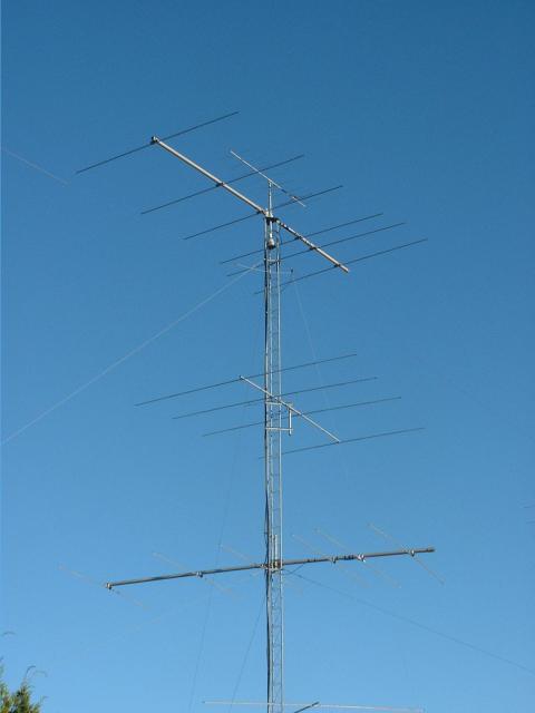 The antennas on the 10 meter tower include: six element yagi, 24' boom at 60', rotatable; six element yagi, 24' boom at 30', fixed NE; four element yagi at 40', fixed SE; three element yagi at 20', fixed W.
