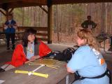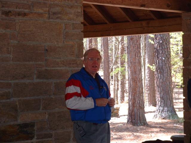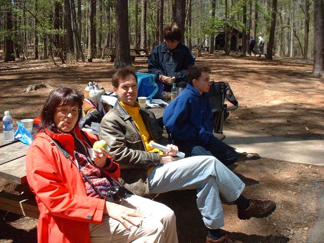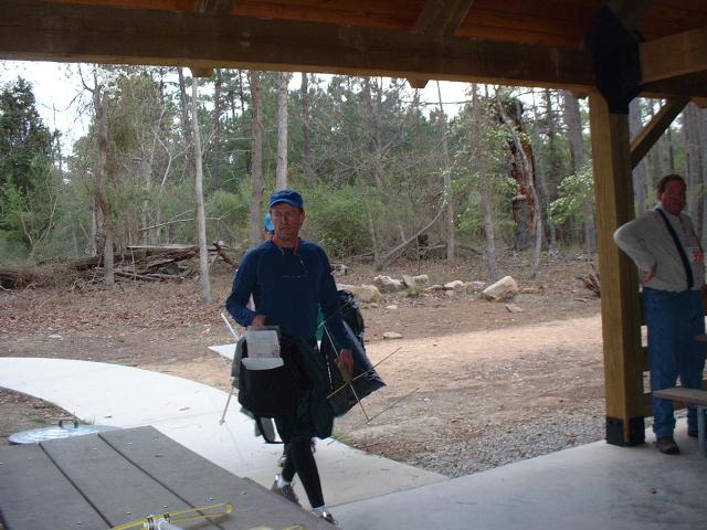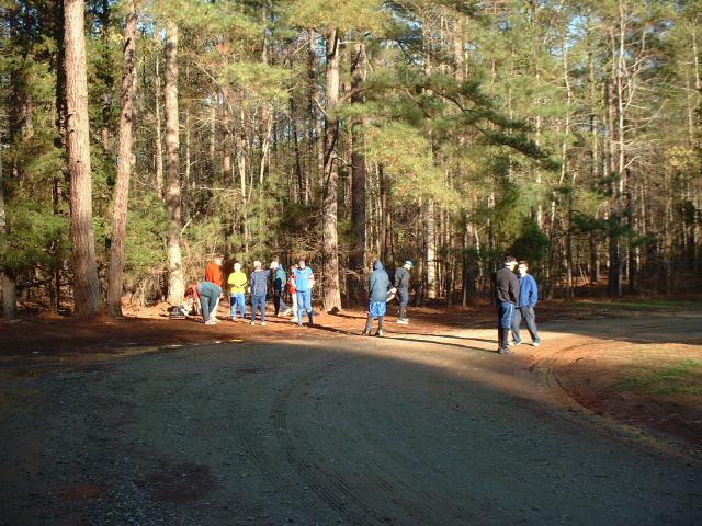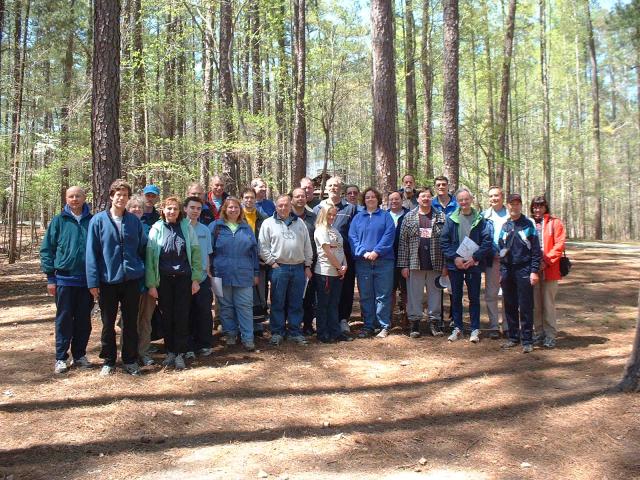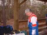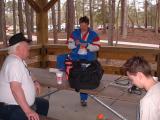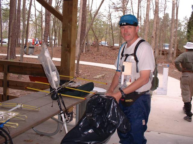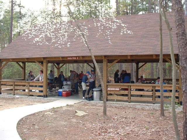 Friday, April 7, was a practice day for competitors to field test their equipment and gain familiarity with the woods near Raleigh. Everyone gathered at this large picnic shelter. We all got small maps of the woods near the shelter. Two each eighty meter and two meter transmitters were put on the air for competitors to go find at their leisure. |