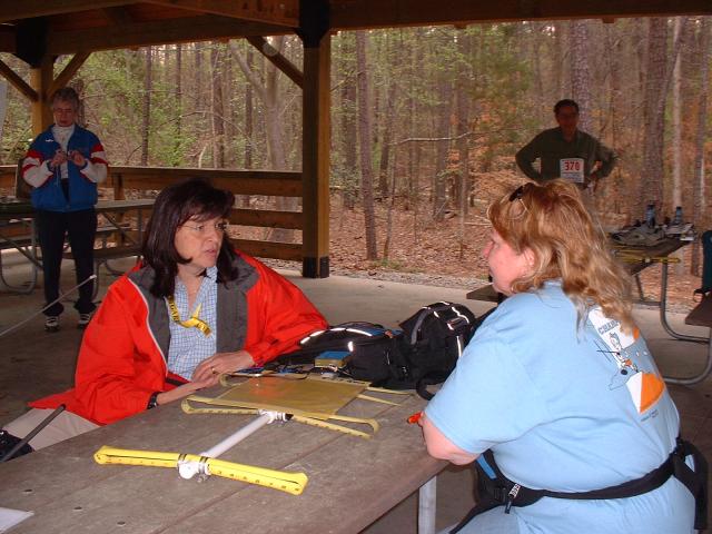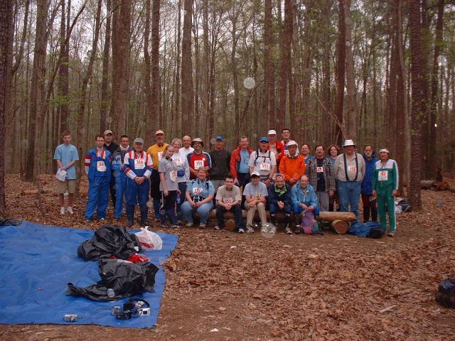 Those competitors who remained after the awards ceremony. Third from left on the front row in the green jacket is Nadia Scharlau. Nadia is probably the top performing athlete on Team USA, with sixth place (two meters) and eleventh place (eighty meters) finishes in the W35 category at the 2004 World ARDF Championships held in Brno, Czech Republic. Nadia designed the courses at this championships to be as challenging as world championship level courses. |