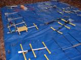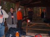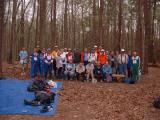 All the competitors in the woods just before the start of the two meter competition on April 8. There was light intermittent drizzle in the morning that would turn into a real solid rain shower by 1:00 PM when the cold front came through. On the blue tarp are bags that would be transported to the finish area after everyone has started. |