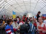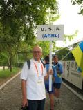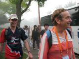 In the coral colored jersey, Jay Hennigan WB6RDV looks for the USA bus. The organizers allocated each bus to one or more countries. I think this helped the organizers make sure that nobody was left behind, as they could rely upon the team captains to report that everyone was present and accounted for. The USA and the Ukraine shared one bus. In the blue jersey is Bruce Paterson VK3TJN, who turned out to be on a different bus that was shared by four countries with smaller teams.