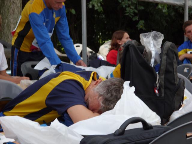 With so many competitors, and starts occurring at five minute intervals, the start times were spread over a three hour window of time. This Ukrainian competitor rests up waiting for his start.