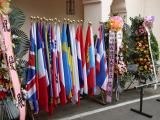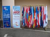 Banners and flags at the hotel entrance. There were 31 flags for the 31 countries represented by competitors, officials, and observers. As it turns out, two of the teams didn't make it after all - but their flags were there nonetheless.