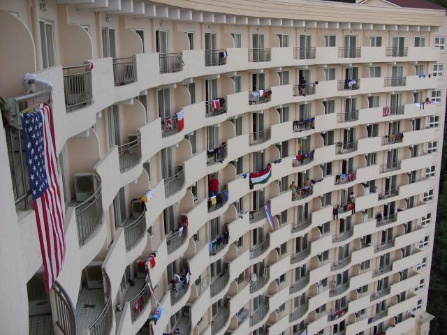 Another view of the hotel itself from our balcony. During the week we were there, a wide variety of international flags and orienteering clothing (set out to dry) would hang from the balcony railings. The American flag belonged to one of our teammates in the room next door.