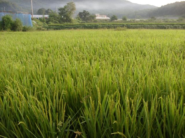 A rice paddy. Rice was growing at various stages of development, from recently transplanted to ready to harvest, throughout the area.