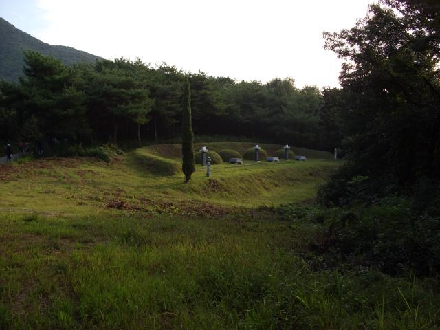 A gravesite. Graves were scattered throughout the competition areas both days. This was the weekend before the Chuseok holiday, which involves visits to gravesites of family ancestors, so the grass and weeds around the graves have been trimmed back. We did not see any modern graveyards in Korea; the majority today apparently opt for cremation.