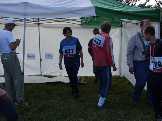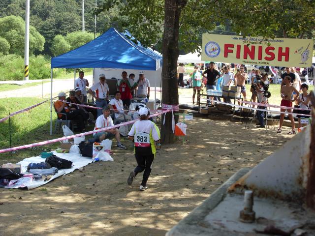 Wang Shuyan (W35) from China runs into the finish line. Wang came in 19th place in this competition, but won a silver medal in the 144 MHz competition two days before - the only medal won by the Chinese at this championships.