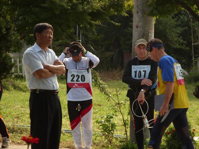 Wednesday, September 3, was the practice day. On the practice day, the organizers put out transmitters that are identical to the transmitters that will be in the field on the competition days. They are placed in a smaller area than the area in which the competition days will be held. Competitors are given a map of the area and can use the opportunity to familiarize themselves with the kind of terrain they will encounter on course. The practice day is also an opportunity to test and adjust the radio receiver gear for optimal performance. We discovered a few useful points of information this way: the transmitters that the Koreans used were louder on 80 meters than what we in the USA were used to, and the maps were not likely to include some man-made objects, including fences.