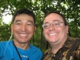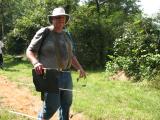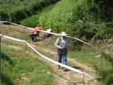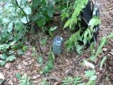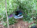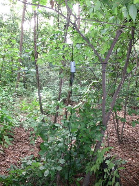 The transmitter and antenna at MOH. The transmitter is the same MyKit FTX-280A transmitter that we used two days before. For an 80 meter antenna, it uses a single vertical wire, that Yoo was able to hang up about six and a half meters in a tree, and a single counterpoise to a ground rod. The transmitter has a matching network in it and a tune indicator to match the random length wires. On 80 meters, the transmitter is A1A (keyed CW). The transmitter in this photo is completely hidden under a bunch of bright green leaves.