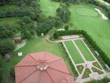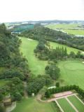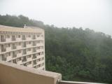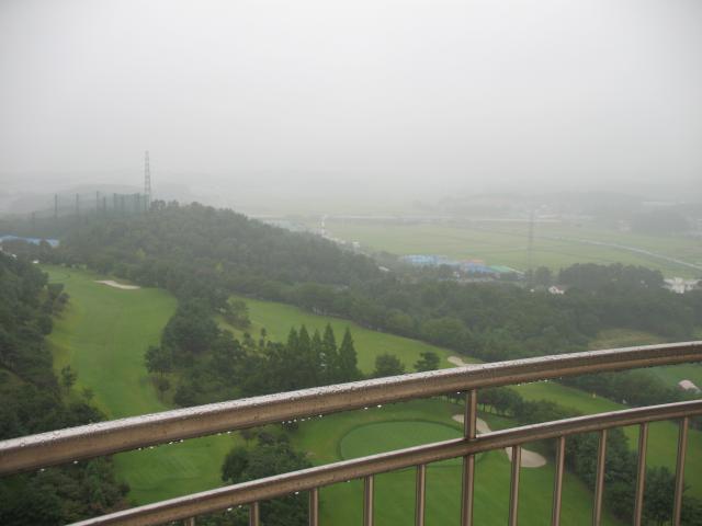 In the rain and fog, you couldn't even see across the little valley we were in. You could only see one hole of the golf course from our room. The green fields on the far side of the road are rice paddies.
