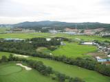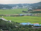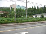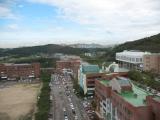 By Tuesday, September 2, the rain had stopped. This is a view from the elevator lobby. In the foreground is the campus of Suwon Science College. It is affiliated with the University of Suwon, and it seemed like all of the students arrived and left via University of Suwon buses or city buses. I think it is a two-year technical school. The dirt field on the left was a soccer field. Every soccer field we saw in Korea was dirt, not grass. In the distance are the high rise apartment buildings of Suwon City.