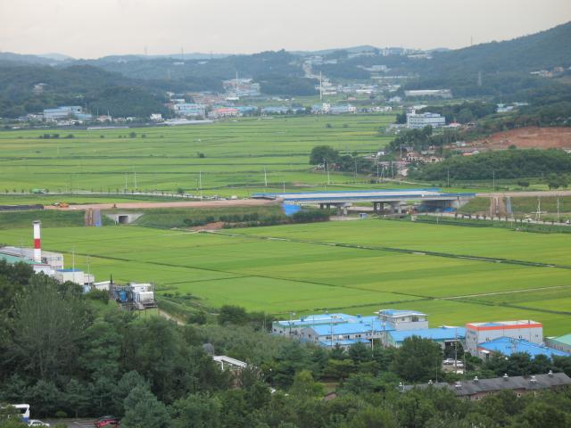 The day we arrived, we went down to the country road for a lunch of kimchi jjige, a spicy stew of pork, cabbage, and chili peppers. There were maybe half a dozen restaurants and as many shops in a ramshackle collection of run-down buildings along the road. This field of peppers was between a FamilyMart franchise convenience store (the nicest store on the street) and a used tire store. The sidewalk was an unusual feature - we did not see many outside of the city center. The building on the hill in the background is part of the Suwon Science College.