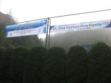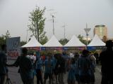 Competitors file into the impound area as two Korean volunteers set up one of the competition banners.