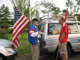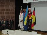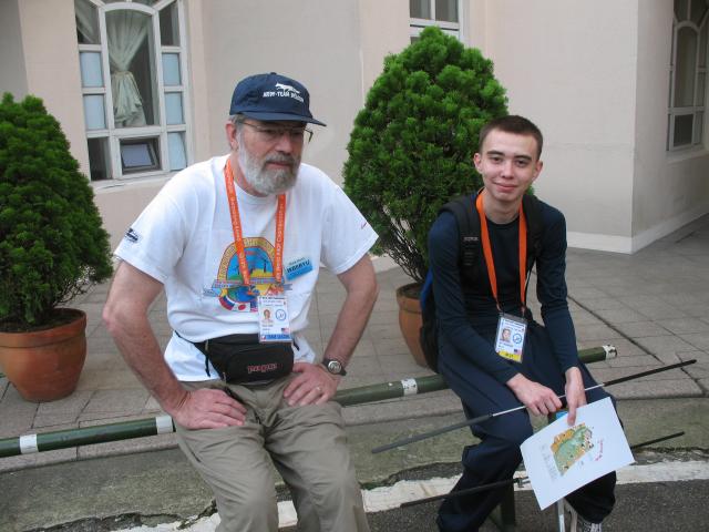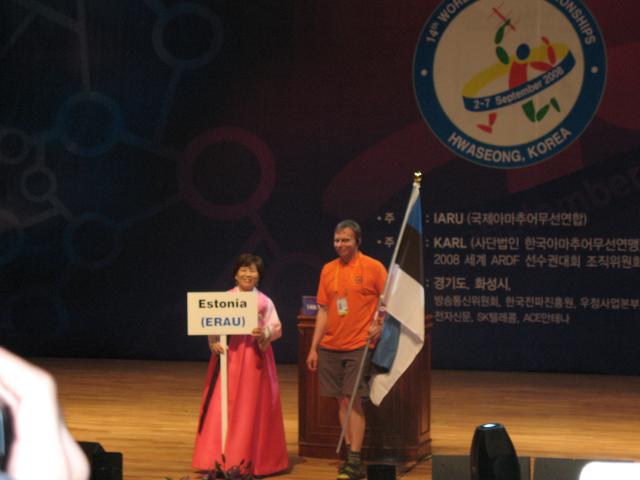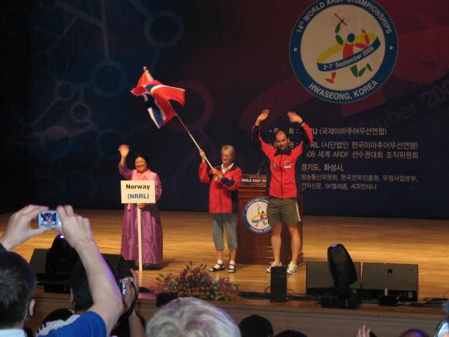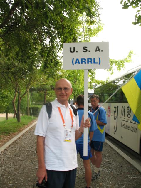 Dale Hunt WB6BYU and Villy Hansen OZ6KH. The flag that Dale is carrying is one he brought with him to Korea - it has travelled with Team USA to every World Championships that the USA has been to.