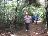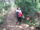 A Chinese runner coming up the trail. She is holding an 80 meter receiver, probably a PJ-80, based on a ferrite rod antenna design. Ferrite rod antenna designs allow for lighter-weight, more-compact receivers, but are not quite as sensitive as magnetic loop receiver designs.