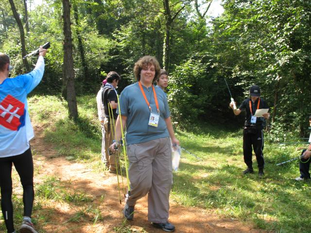 A member of the Czech Republic team, practicing on 144 MHz. Her receiver incorporates only two elements to create a directive pattern.