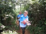 Jen Harker W5JEN, on the trail during the practice. Jen is holding a 144 MHz rig made from a VK3YNG Foxhunt Sniffer Mark IV receiver and a home-made WB2HOL tape measure yagi.
