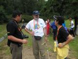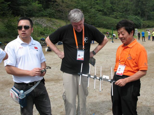 Wang Lijun BD1OO from China (left) was promoting the products of the Beijing TopRadio Science and Technology Company. Here he is showing two of the international jurors, Rainier Floesser DL5NBZ (center) and Chen Ping BA1HAM (right) an ARDF receiver designed for 433 MHz, a radio frequency that is not frequently used for recreational direction finding outside of China.