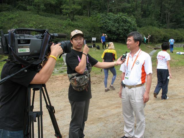 The local media showed up for the practice. In addition to filming at some of the practice transmitters, they interviewed the organizers. Han Jeong Hoon HL2AGG, the President of the Korean Amateur Radio League, is preparing to answer questions for a television news reporter.