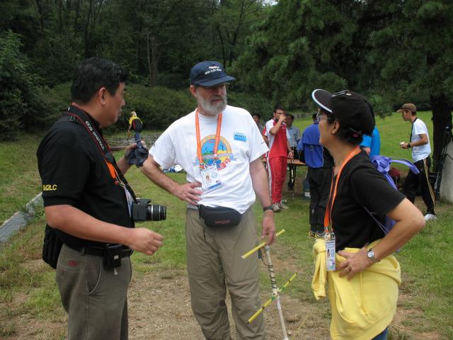 Dale Hunt WB6BYU discusses the event with two IARU Region III observers. Lim Kean Chuan 9M2LC, on the left, came from Malaysia, and Thida Denpruektham HS1ASC, on the right, came from Thailand. Thida has persuaded Region III to allow her to host the 2009 IARU Region III ARDF Championships in Thailand. Thailand has the third largest amateur radio operator population in the world.