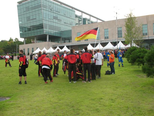 Team Germany gathering on the lawn. The performance hall building had a very modern style to it.