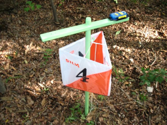 The control flag and electronic punch for the finish beacon on the practice day. The championships used SportIdent electronic timing devices. All of the controls used steel stands just like this.