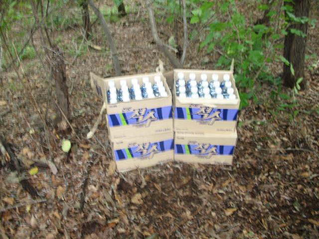 Transmitter number 4 (MOH) about an hour before the first start. Our location was in a broad spot in a gully formed by a normally dry stream. We were given one box (20 bottles) of water for runners to take. This proved to be woefully inadequate.