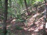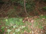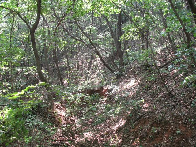 Looking upstream from the transmitter location. The sides of the gully were moderately steep. Maybe half of the competitors to arrive at the control approached it by walking along the top of the ridge on one side or the other and came down the sides of the gully directly to the flag.