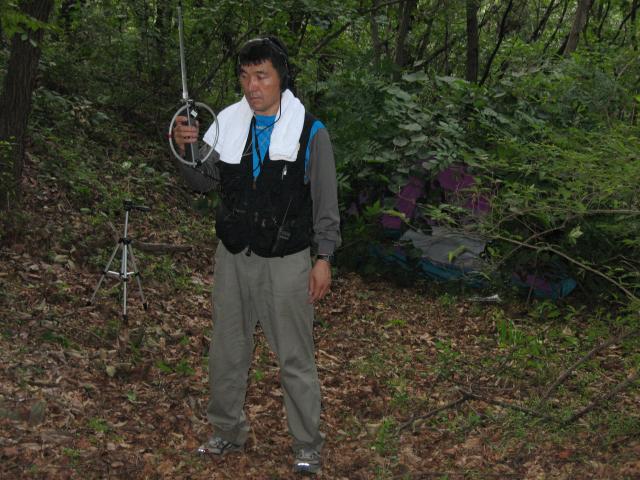 The transmitter operator at my control was Yoo Dong Gul DS4OMS. Yoo was in charge of setting up the transmitter and doing any troubleshooting necessary with the equipment during the competition. We brought my RF-2D 144 MHz receiver to be able to verify that we could hear all the transmitters from our location. Yoo's trousers are wet because we had to walk through some meadows with heavy morning dew to get to our patch of woods.