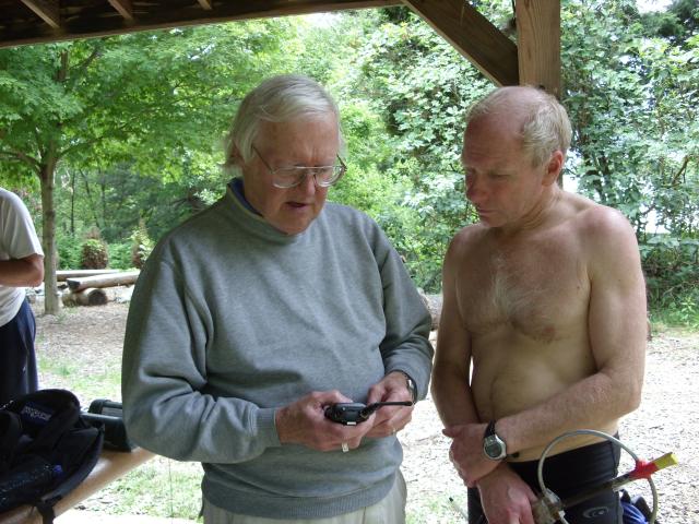 Dale Hunt WB6BYU from Oregon (right) describes the design of his homebrew 80 meter receiver to Masahiko Mimura JH4JQH (left), who came to the championships from Tokyo, Japan. Dale is the IARU Region II ARDF Coordinator.. |