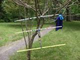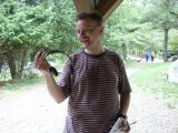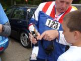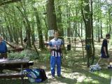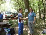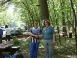 On Sunday afternoon, after all the runners had come in, Vadim Afonkin KB1RLI opened the awards ceremony. Behind him, strung between two trees, are small pieces of paper that record the times for each of the competitors. As soon as a competitor's time is computed, the paper is stapled onto the string in the relative order of finish with the other competitors in the same category. This is a traditional, low-tech way of posting a running "scoreboard" during orienteering meets in North America. |
