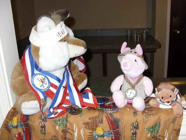 Ardy Fox, the official team mascot of Team USA, together with Hamlet and a new friend. Ardy has a medal from each of the USA ARDF championships. |